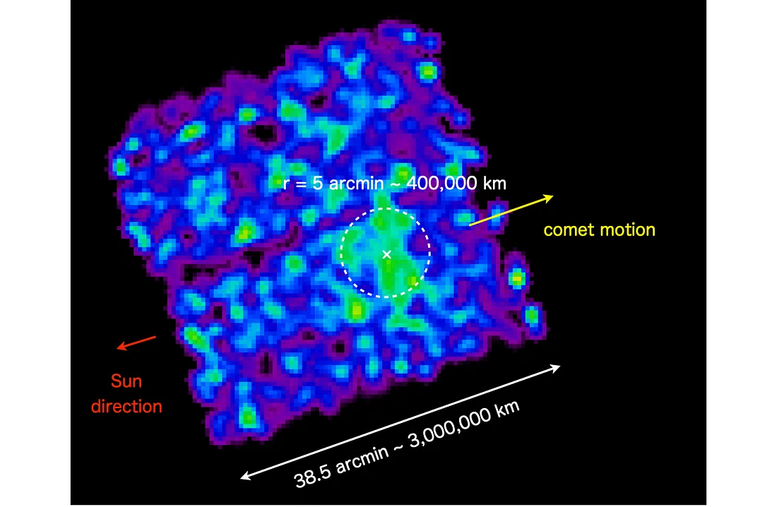 Zdjęcie rentgenowskie 3I/ATLAS wykonane przez kamerę rentgenowską Xtend na pokładzie obserwatorium XRISM. Zdjęcie obejmuje pole widzenia o szerokości około 3 mln km i ukazuje słabą emisję promieniowania rentgenowskiego sięgającą do 400 tys. km od obiektuAnaliza wykazała obecność charakterystycznych linii emisyjnych węgla, azotu i tlenu – klasycznych sygnatur procesu charge exchange. Zaskoczył jednak rozmiar halo rentgenowskiego: aż 400 tys. km. To ogromna wartość jak na obiekt o jądrze mniejszym niż kilometr.