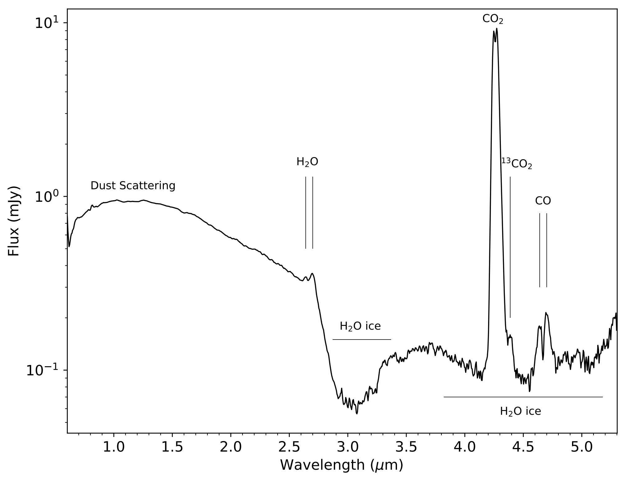 Widmo bliskiej podczerwieni 3I/ATLAS zmierzone przez instrument NIRSpec na JWST. Przedstawia jasność 3I/ATLAS (oś pionowa) w funkcji długości fali światła (oś pozioma). Gazy tworzące 3I/ATLAS (H2O, CO2 i CO) można zaobserwować jako piki emisyjne, oznaczone odpowiednimi nazwamiSkąd ta anomalia? Naukowcy rozważają dwa scenariusze: