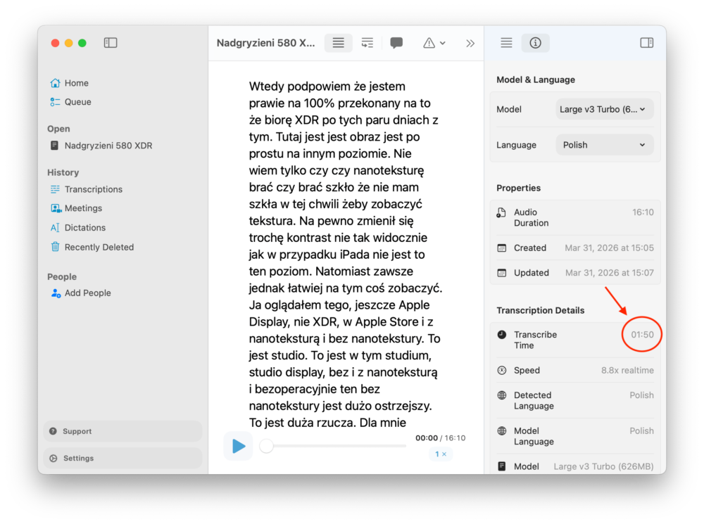 Jeśli chcecie wykonać własne testy w MacWhisper, to najpierw pobierzcie pliki audio dla Nadgryzieni nr 300 (bezpośredni link 8,9 MB) i dla nr 477 (bezpośredni link 83,7 MB), potem wykonajcie test stosując model Large V2 (GGML Whisper Large multilingual) i osobno Large V3 Turbo (WhisperKit), a potem podeślijcie mi takie informacje, jakie znajdziecie w tabelce, w tym pełna specyfikacja komputera. Niepełne zgłoszenia będą odrzucane. Podpowiem jeszcze, iż MacWhisper wyświetla ile zajęło mu wykonanie transkrypcji po jej zakończeniu.