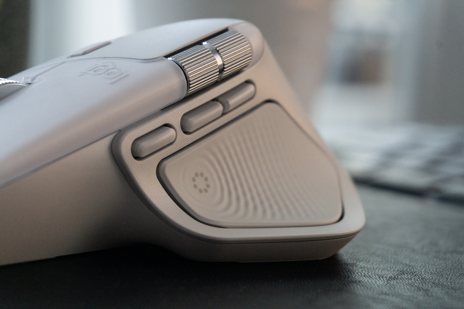 W poprzednim MX Masterze boczny panel kciuka skrywa pod ogumioną obudową dodatkowy przycisk gestu, możliwy do wciśnięcia dociskiem wystającego skrzydełka do podłoża. Feeling podczas tej akcji jest kapitalny. Z kolei domyślny efekt, w postaci poglądu wielu uruchomionych okien na MacOS/Windows, bardzo praktyczny.