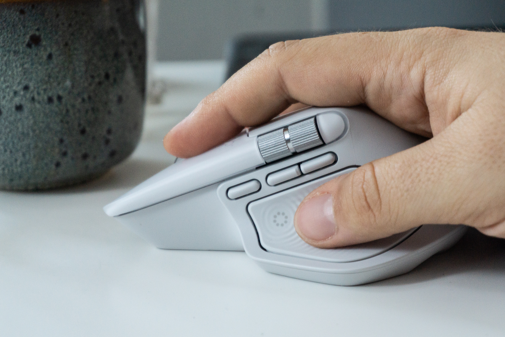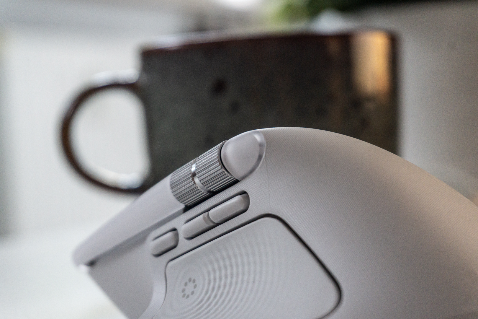 Jak wspomniałem wcześniej, używanie nowego przycisku gestów nie jest wygodne, jeżeli Bozia wyposażyła cię w mniejsze dłonie. Mniej wygodna jest też obsługa przycisków wstecz/dalej, ponieważ są gorzej odseparowane względem tego samego rozwiązania na MX Masterze 3S. Za to rolka pozioma stała się nieco większa i lepiej usytuowana, co za tym idzie, przewijanie arkuszy w Excelu jest teraz minimalnie wygodniejsze.