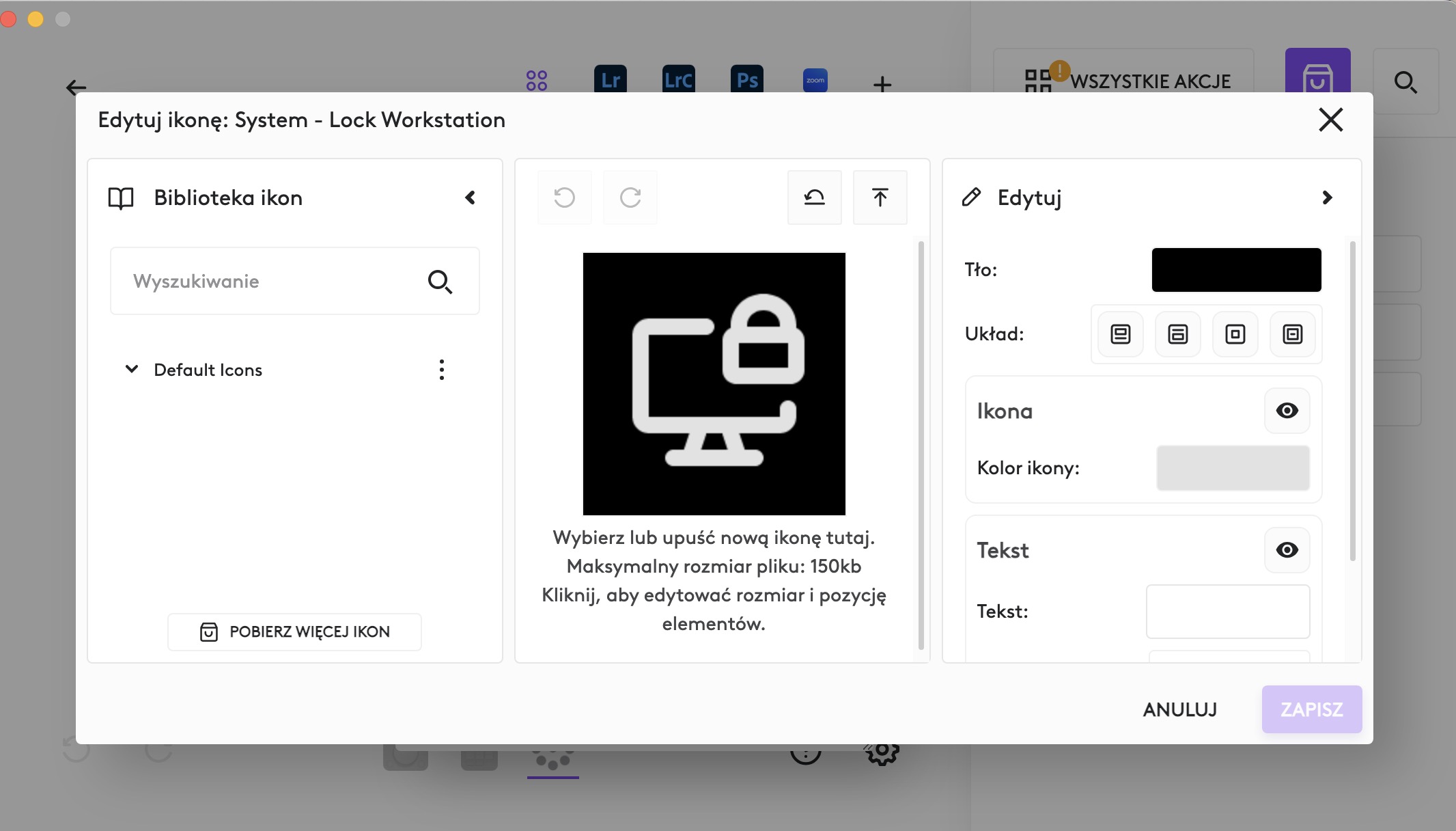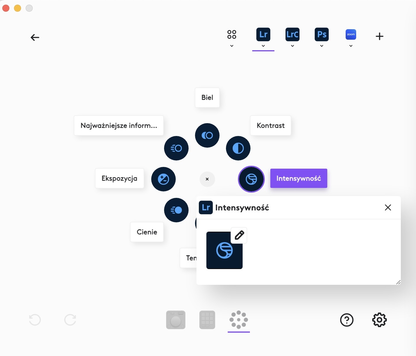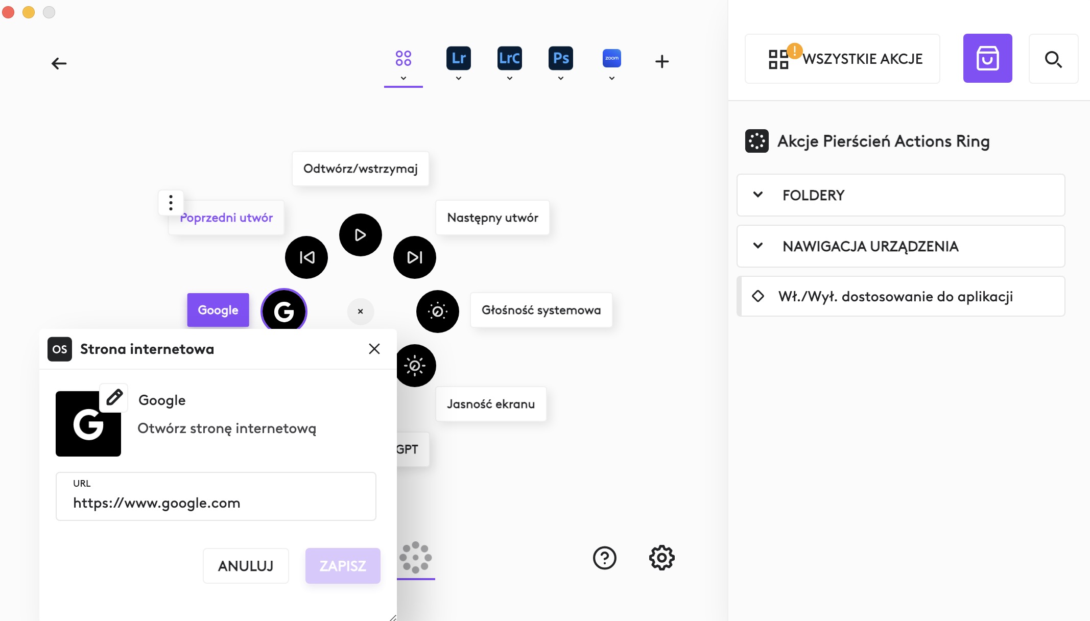 Kapitalne jest to, iż róża Actions Ring wyświetla się kontekstowo. Gdy włączamy ją na pulpicie, widzimy ogólny zestaw domyślnych skrótów, jak przewijanie utworów, regulacja jasności ekranu, regulacja głośności, wylogowanie użytkownika, szybki dostęp do asystenta AI czy szybkie otwarcie przeglądarki z wyszukiwarką Google na froncie. jeżeli jednak odpalimy Lightrooma, Photoshopa czy Final Cuta, układ skrótów zmienia się, dopasowując do narzędzi danego programu.