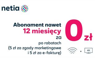 Netia ruszyła z promocją "12 miesięcy za 0 zł" dla pakietów łączących najszybszy światłowód operatora, Telewizję 4K w wariancie L i usługę Bezpieczny Internet Ultra. Jak podano w komunikacie, abonenci są zwolnieni z opłat przez pełnych 12 miesięcy, a oferta dotyczy opcji do 1 Gb/s oraz do 2 Gb/s na sieci własnej Netii.