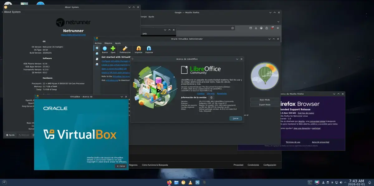 Grafika: NetrunnerNa desktopie króluje KDE Plasma 6.3.6 wraz z KDE Frameworks 6.13 i Qt 6.8.2. To duży przeskok względem starszych wersji – środowisko jest bardziej responsywne, nowocześniejsze wizualnie i lepiej zoptymalizowane. Co ważne, Netrunner przez cały czas oferuje sesję X11 (opartą na XLibre), co może być istotne dla osób unikających Waylanda.