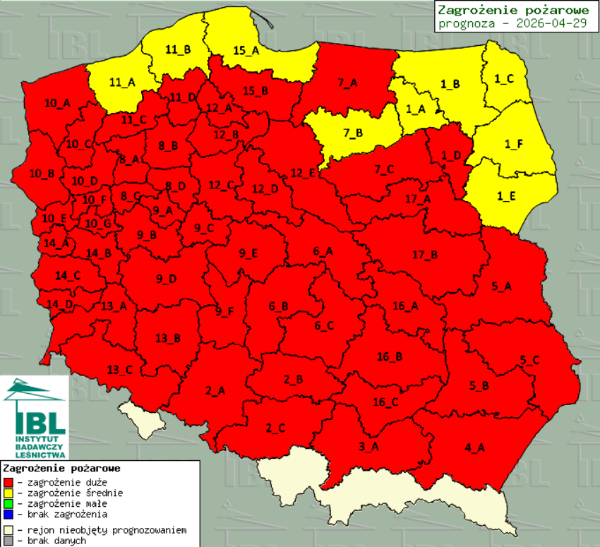 Jak wynika z mapy Instytutu Badawczego Leśnictwa, niemal w całej Polsce występuje duże zagrożenie pożarowe w lasach. Wyjątek stanowią jedynie północne i północno-wschodnie regiony. I tam sytuacja jest daleka od spokojnej, bo zagrożenie oceniono jako średnie. To żółte wysepki na czerwonym tle.