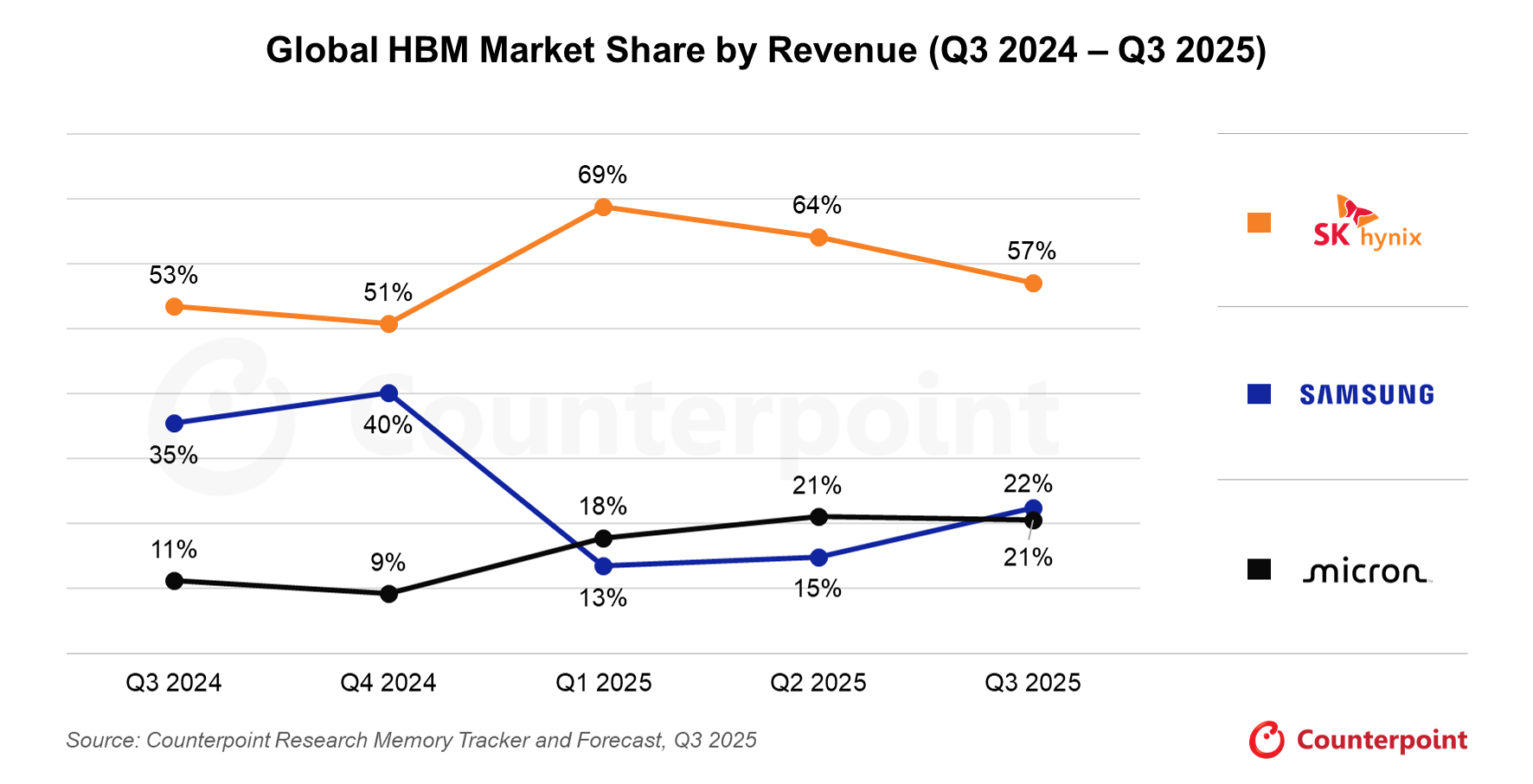 SK Hynix pozostaje niekwestionowanym królem najbardziej dochodowego segmentu – pamięci HBM. W III kwartale 2025 r. firma utrzymała dominujący, 57-procentowy udział w tym rynku. Dla wicelidera, Samsunga, z udziałem 22%, segment HBM pozostaje wyzwaniem. Choć gigant zapowiada ofensywę z układami HBM3E i nadchodzącym HBM4 w 2026 roku, w III kwartale musiał uznać wyższość rywala w tym konkretnym niszowym, acz kluczowym obszarze.