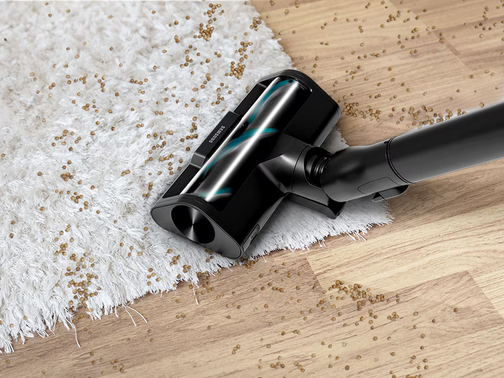Na podłogach twardych Bespoke Jet AI Ultra jest absolutnym mistrzem. Elektroszczotka Slim LED AI z podświetleniem doskonale zbiera wszystko – od mąki po ryż (no, kurze też oczywiście), zwykle za jednym pociągnięciem, choć wiele zależy od… rozmiarów sprzątanych obiektów. Test z rozsypanymi płatkami ujawnił pewien drobny mankament, bazowa elektroszczotka do podłóg twardych ma oprócz aktywnie obracanego walca statyczną, puchatą szczotkę na rolkach. Ta szczotka obraca się w miarę, jak przesuwamy elektroszczotkę po podłodze, ale ze względu na swoją fakturę w przypadku większych obiektów (jak np. kukurydziane płatki) działa bardziej jak spychacz, a nie odkurzacz. Jednak te większe problemy zaczynają się gdzie indziej i są, niestety, zauważalne, warto je mieć na uwadze, decydując się na ten sprzęt.