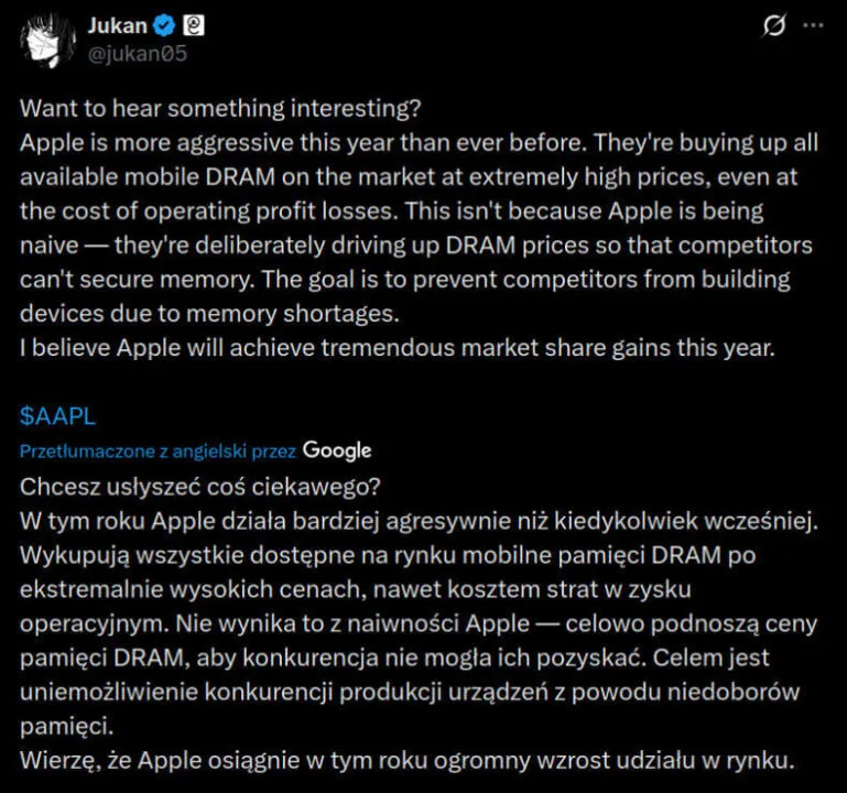 Największą niewiadomą jest to, jak długo producenci pamięci będą w stanie funkcjonować przy tak ograniczonych mocach przerobowych. Zwiększenie produkcji DRAM trwa miesiącami, a do tego czasu Apple będzie miało przewagę, jakiej nie miało nigdy wcześniej.