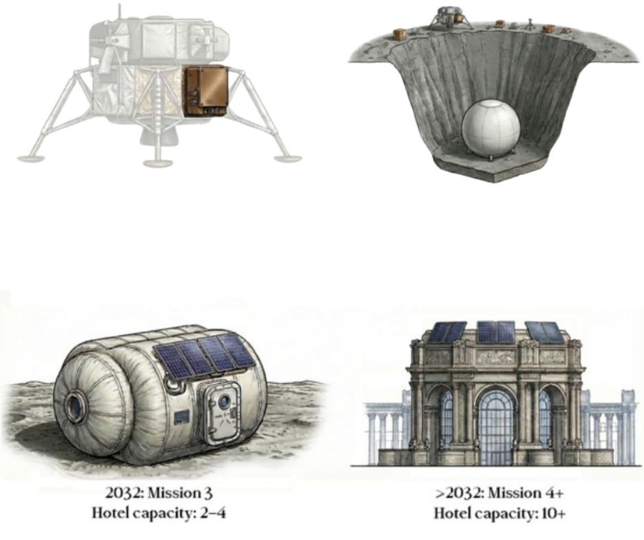 Zanim na Księżycu powstanie hotel rodem z pałacowych wizji, GRU Space musi przeprowadzić serię zaawansowanych testów. Pierwsza misja, planowana na 2029 r., przewiduje wysłanie ładunku o wadze 10 kg z nadmuchiwaną strukturą i technologią przekształcania regolitu w cegły z użyciem geopolimerów. Drugi etap zakłada próbę większego modułu umieszczonego w księżycowym zapadlisku, gdzie firma sprawdzi system pozyskiwania i przetwarzania lokalnych surowców. Pierwszy hotel dla czterech gości na wystartować około 2032 r.