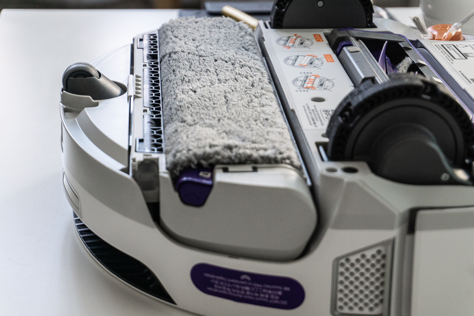 Ruchoma szyna mopująca z funkcją podnoszenia/opuszczania. Opuszczana osłona otworu ssącego. Hydraulika umożliwiająca pokonywanie progów o wysokości 3 cm (łączonych na 4 cm). Dodatkowe tylne kółeczko zwiększające zwrotność. To wszystko elementy, przez które Narwal Flow jest odczuwalnie wyższy (9,7 cm) od typowego robota. choćby mimo braku wieży LIDAR. Zamiast niej, LIDAR znajduje się z tyłu.